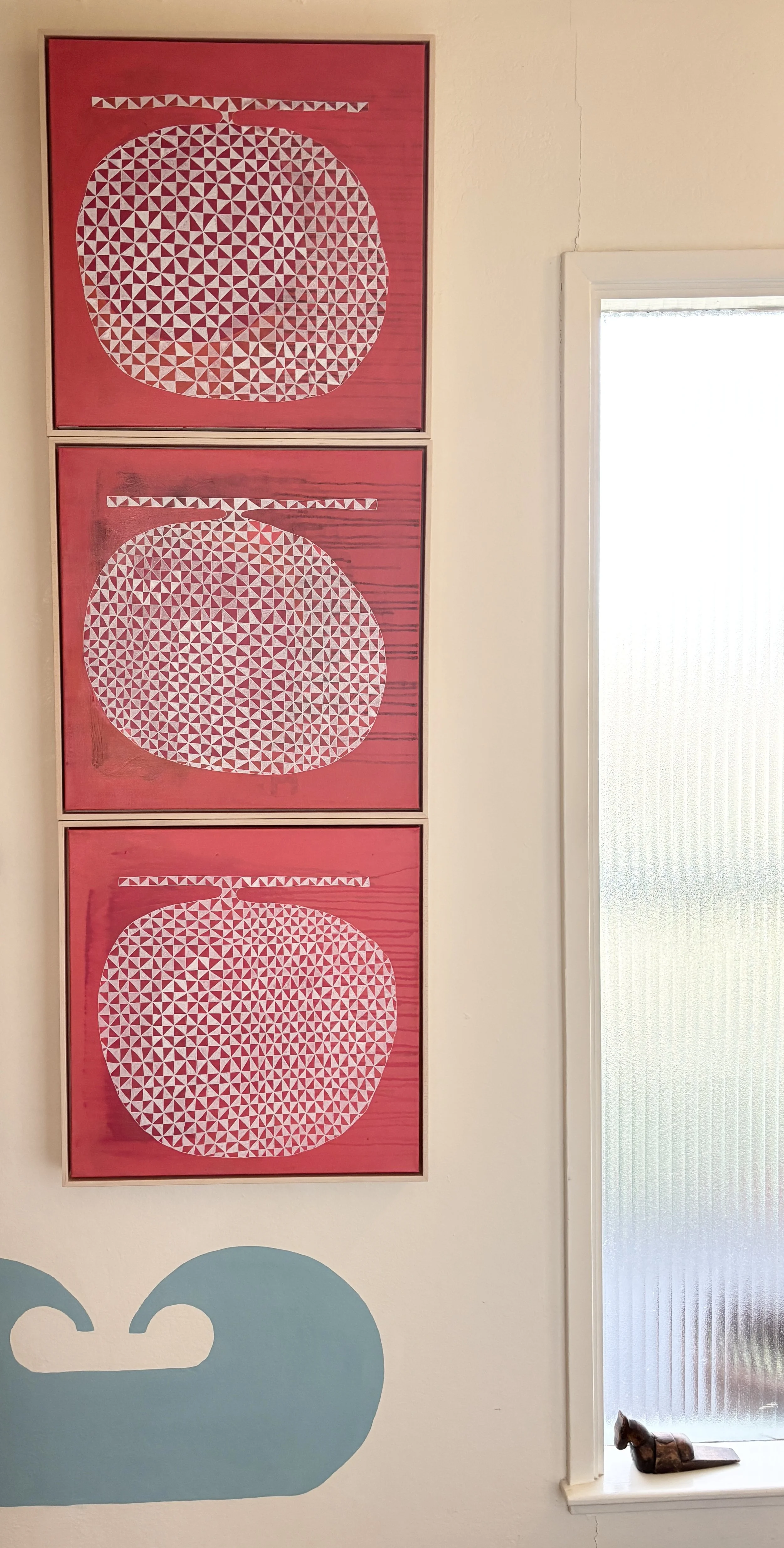 Acrylic and mulberry paper on 3” balsa wood circles connected to driftwood with jute. Finished with D-rings for easy hanging.