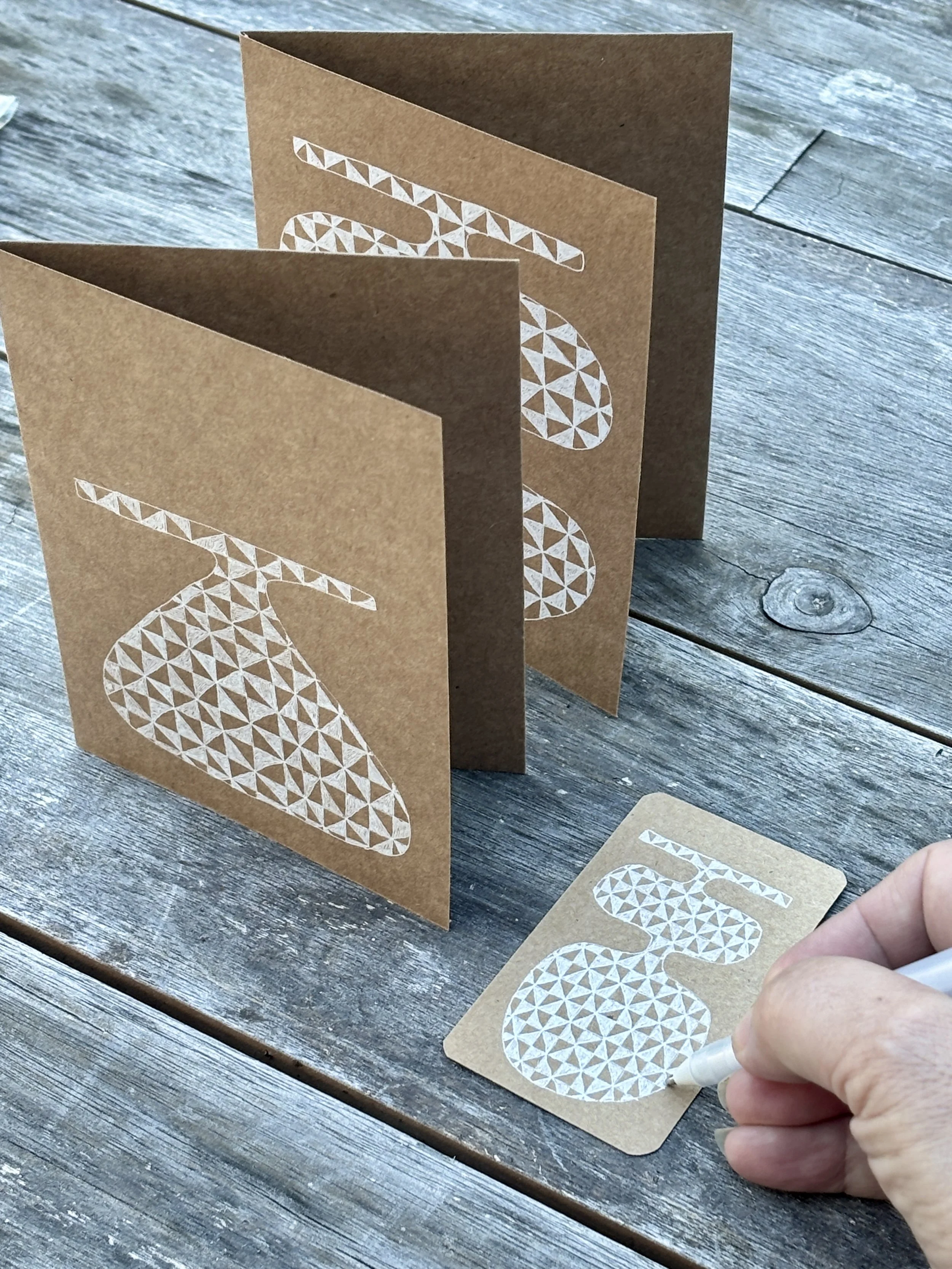 Miniature paintings of vintage tea cups on wood and an assortment of hand drawn greeting cards.