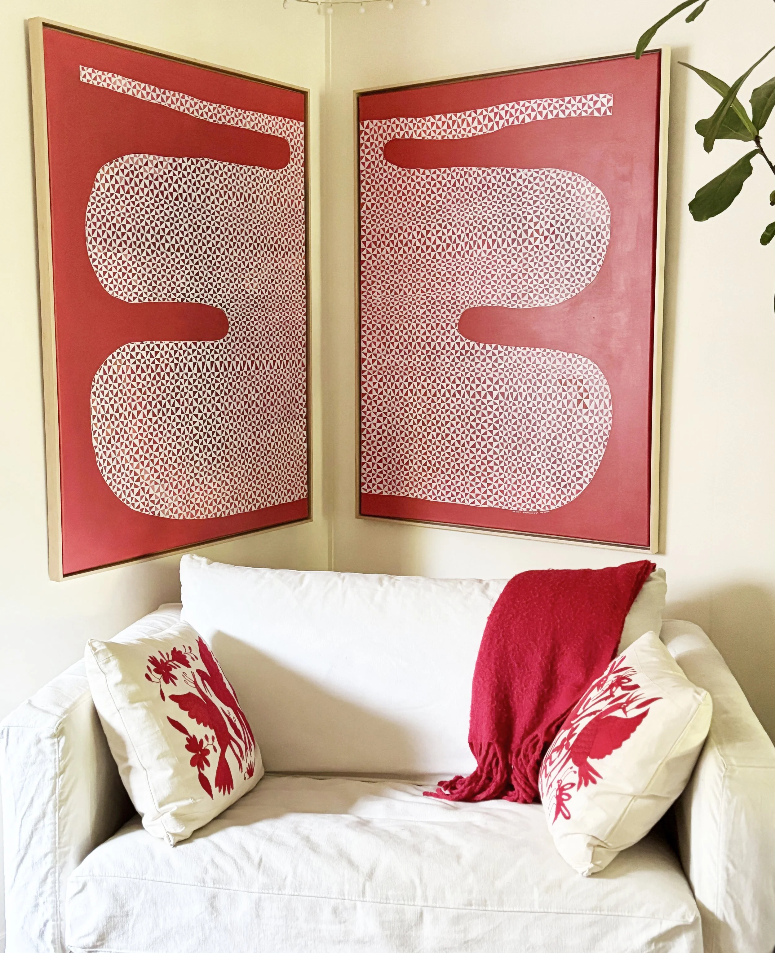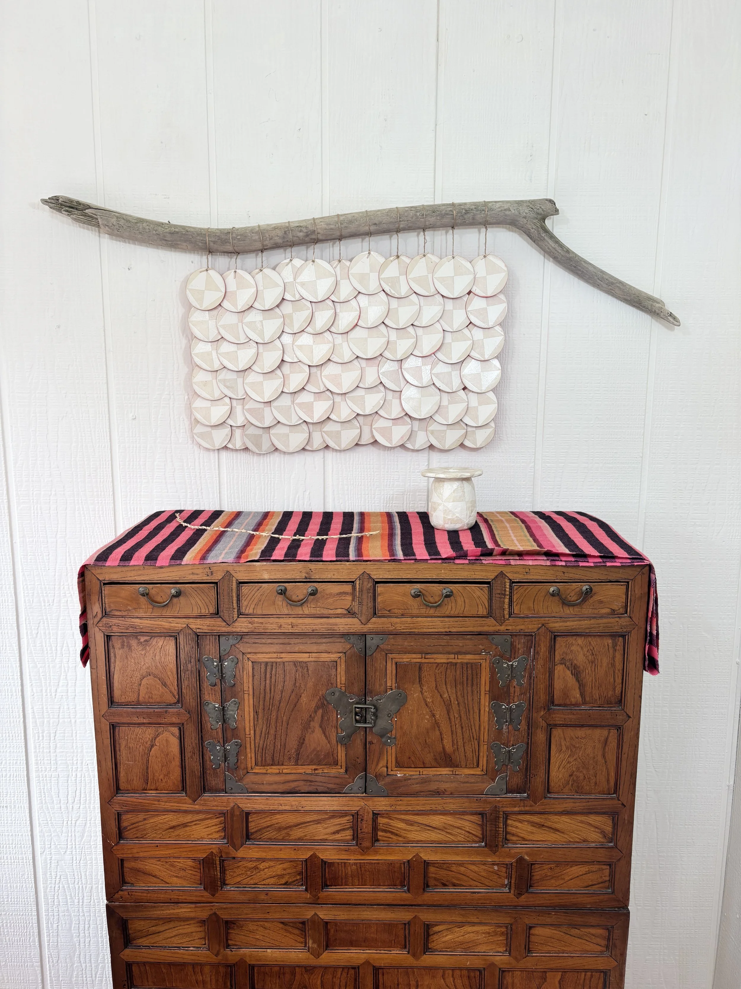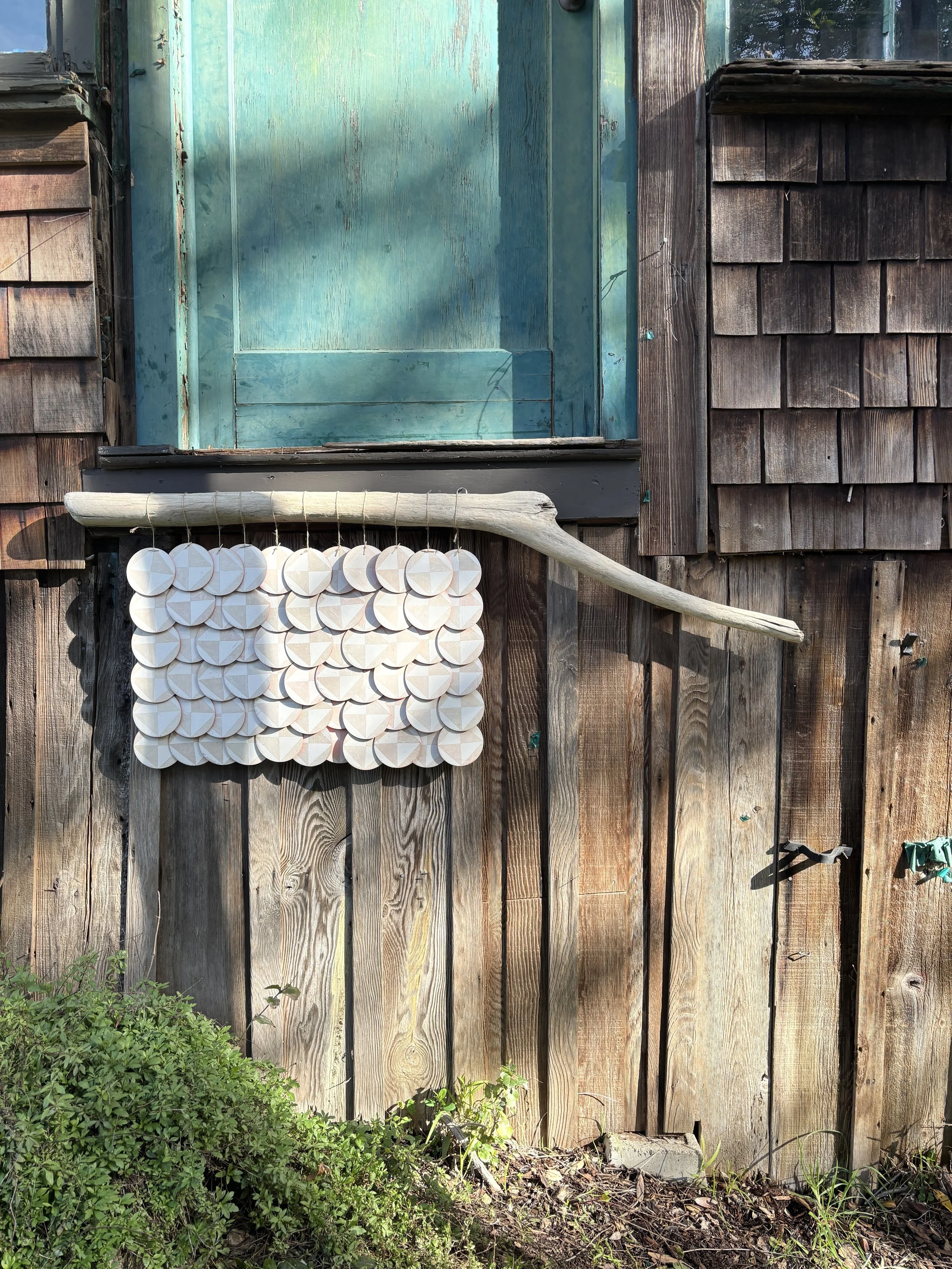 Acrylic and mulberry paper on 4” balsa wood circles connected to driftwood with jute. Finished with D-rings for easy hanging.